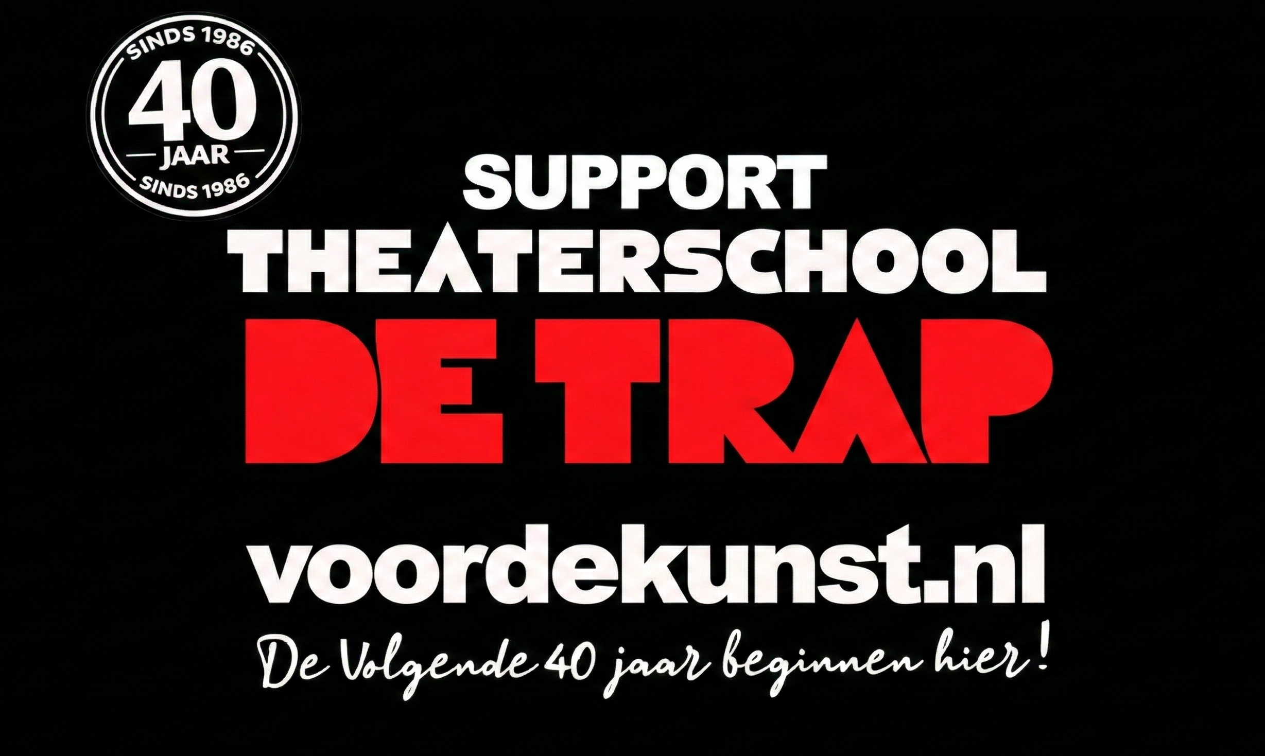 Theaterschool De Trap biedt al 40 jaar wat nergens anders bestaat: een vierjarige, professionele parttime vakopleiding. Dit jaar vieren we deze bijzondere mijlpaal, maar de toekomst van de school staat op het spel. Wat hier de komende 40 jaar gebeurt, beslissen we vandaag. We hebben jouw hulp hard nodig om deze unieke plek te behouden. Zodat huidige studenten hun opleiding kunnen afronden en nieuw talent een kans blijft krijgen.